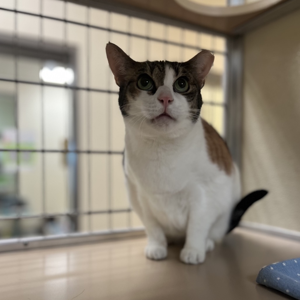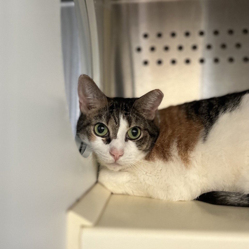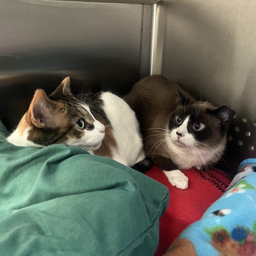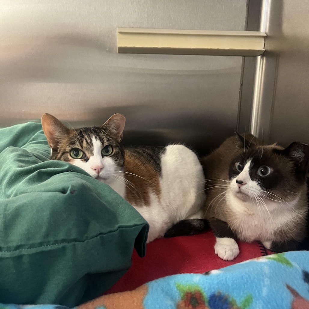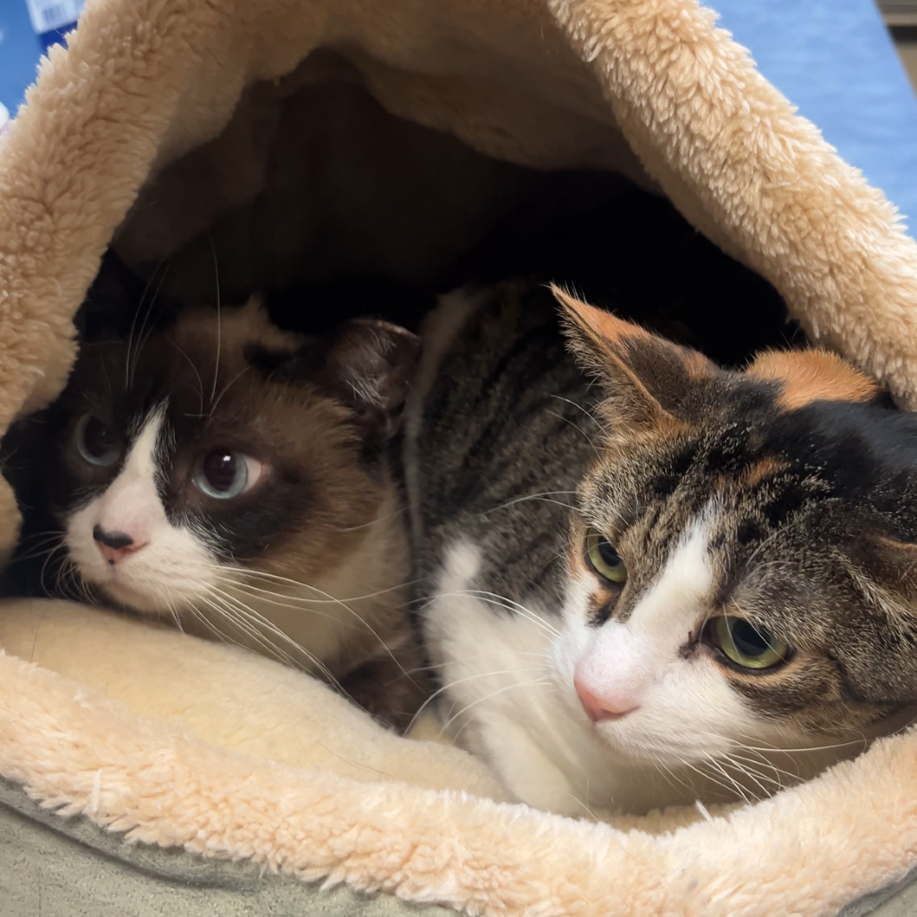 Calling all shy cat people! Sisters Sophie and Spots are looking for a home together. These sweet girls have spent their whole lives together, and sadly last summer their owner passed away. They came to us a bit shut down and overwhelmed, but they have spent some time in a home since then and have shown us their playful, chatty, and affectionate sides. Sophie the Siamese is the most shy. She loves Spots, and spends most of her time cuddled up next to her. She feels safest hiding in cat beds like these, or perched up high on her cat tower. Spots is the duo's attention seeker. She is talkative with the cutest squeak of meow. She loves to play with toys and she is usually the one seeking out affection. These girls are still very shy, especially in overwhelming environments, so they are looking for a chill home. If you have a calm household and are looking for two sweet girls who keep to themselves but still love a good gentle pet, stop by today to meet Sophie and Spots!