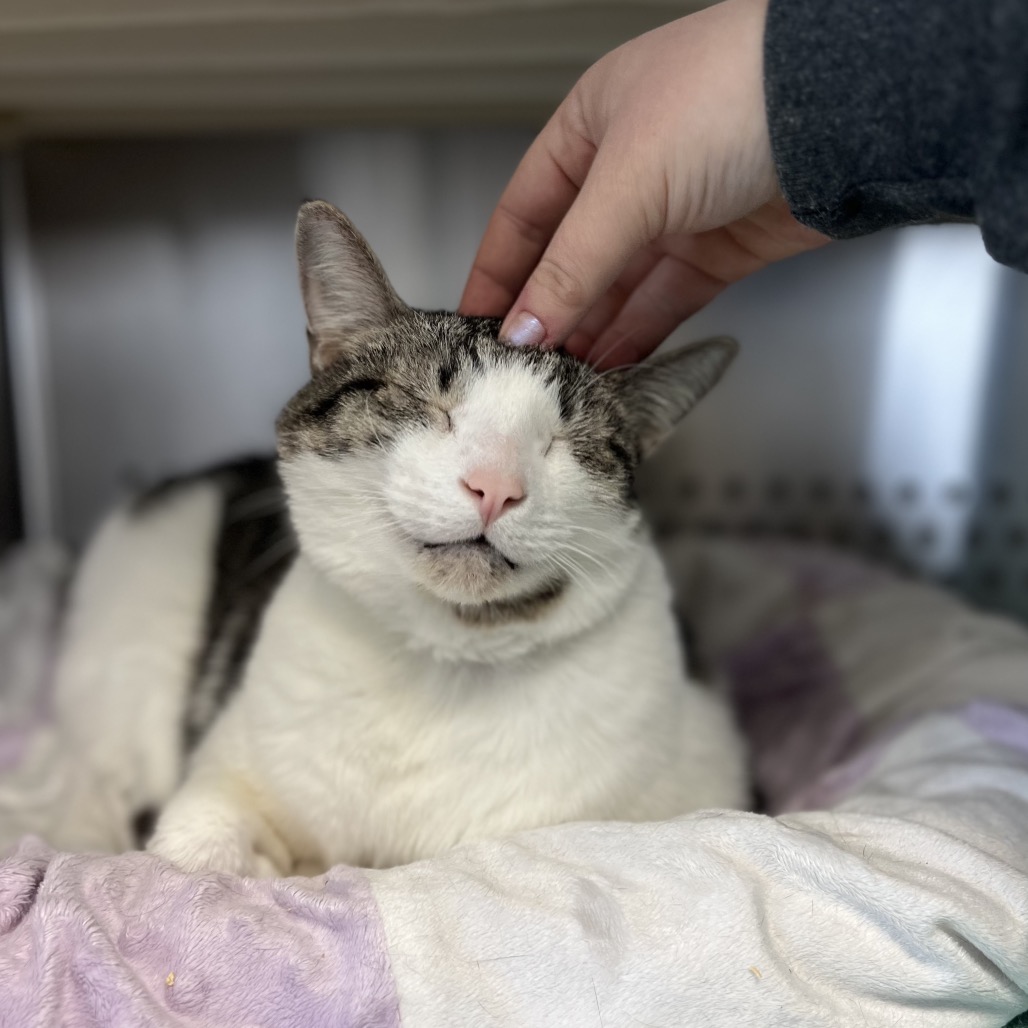 Meet our sweet old smiling boy Poindexter! Poindexter is approximately 13 years and 12 lbs. He is looking to spend the rest of his days on a comfy couch or hanging our in your cabinets (see slide show.) Poindexter is a very chill kitty who just enjoys being around you and knowing that you are near. He loves body scratches and to play with his string toys. He has been around other cats, dogs and children, and has done well! He is both FIV and FeLv negative, up to date on his vaccines, and neutered. If you would like to take Poindexter home as a foster or as a permanent member of your family stop by any time or email [email protected] or [email protected].