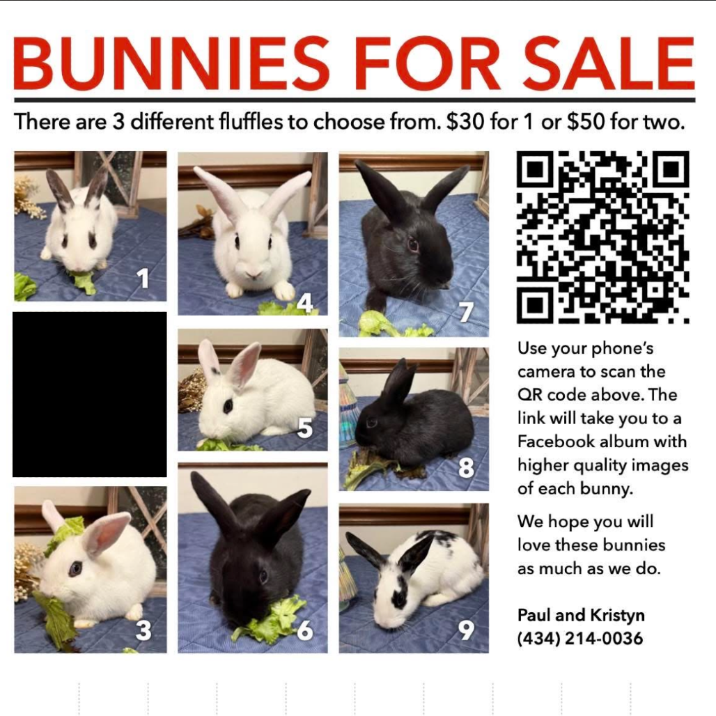 Everybody, meet Sir Pickles! Sir Pickles is a young adult bunny looking for a home! They're very sweet and come up and rub noses with people. They do great with other bunnies, and have been hand-raised since they were young! If you are interested in Sir Pickles, please contact Kirstyn at (703) 577-0894 or at [email protected]!