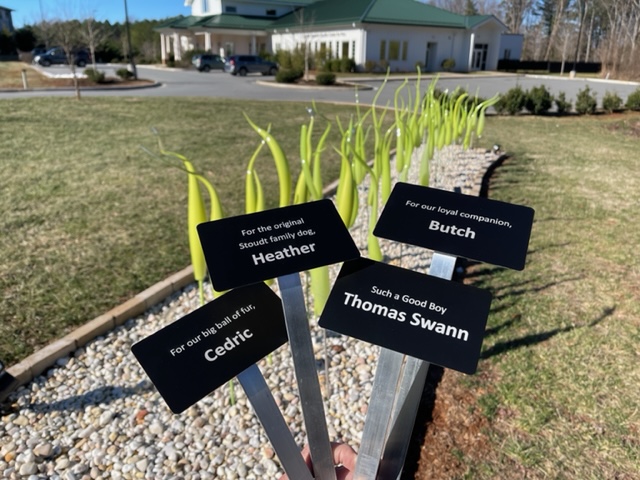 Another special way to donate in honor of a loved one is with our Celebration Garden! For a $250 donation, you can name one of our one-of-a-kind Glass Sculptures designed by local artist Paul Clements. Each one is unique, just like the pets we serve.