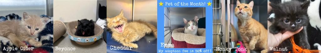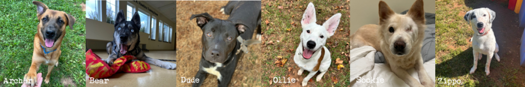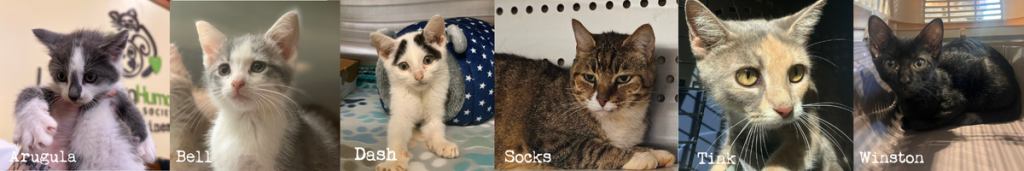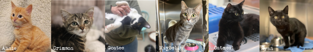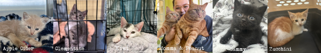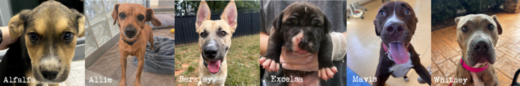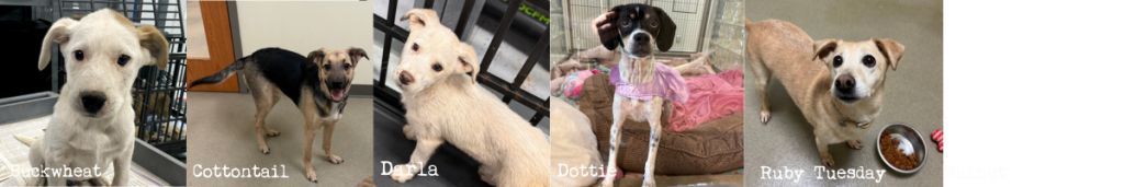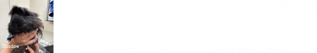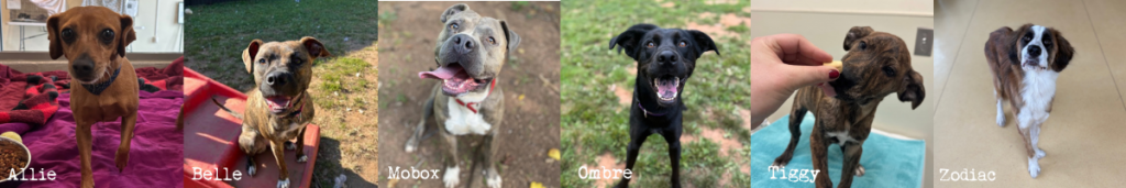 Allie, Asta, Ava, Belle, Chance, Miss Piggy, Mittens, Mobox, Ombr, Pidge, Raisin Bread, Reba, Riley, Tiggy, Waylon, Zodiac.