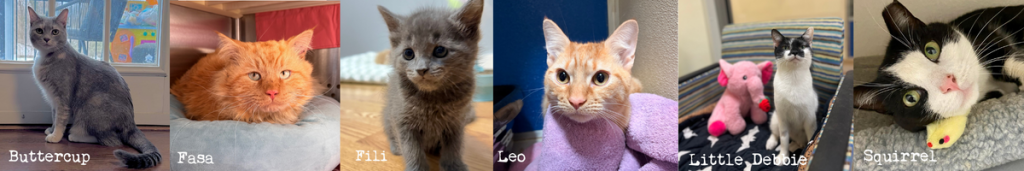Bandit, Boo Batter, Clyde, Eloise, Elvis, Fig, Flash, Fluffy, Freddy, Gingeroot, Gladys, Justin Bobby, Led Zeppelin, Lucius, Lumiere, Mango, Mercutio, Neapolitan, Nugget, Peaches, Peppermint Patty, Pippi Longstockings, Pire, Pleakley, Raven, Sage, Sharon, Teddy, Unicorn, Van Halen, Water Lily.