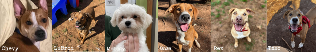 Amelia, Angie, Annie Sue Pig, Cali, Cavalier, Cobblestone, Coconut, Daisy, Freya, Jeffrey, Mary Jane, Mimi, Missy, Oswald, Rhett, Roxie, Selena, Trader Joe, and Zeus.