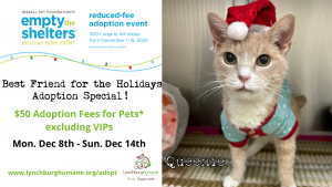 Come on down to the Center for Pets December 8th – 14th for the Empty the Shelters Best Friend for the Holidays Special made possible by the BISSELL Pet Foundation!