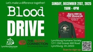 Let’s make a difference together this holiday season with a (human) blood drive! The Blood Connection is joining us on Sunday, December 21st to host a blood drive.