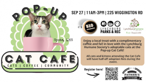 Enjoy a fresh brewed treat with a complimentary coffee and fall in love with the Lynchburg Humane Society’s adoptable cats at the Pop-up cat café! Adoption and donation opportunities will be on site with the Lynchburg Humane Society! All participating cats and kittens will be 50% off their regular adoption price during the program.