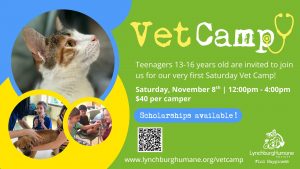 Join us for our very first teen Saturday Vet Camp! Teens 13-16 years old are invited to join us to learn more about the animal medicine and animal welfare fields! Vet camp will include educational material, hands-on learning, special guests, and a book and t-shirt to take home. For scholarship information, please email [email protected].