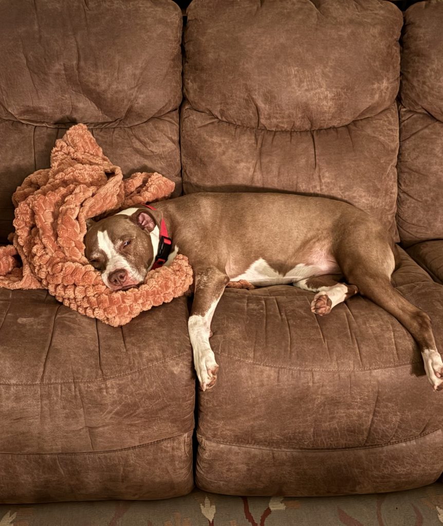 Shortly after Riley’s return, we pushed hard to find him a foster home. We were lucky enough that someone stepped forward during the winter storm to take him home! What was initially supposed to be a few days away from the shelter during the storm quickly and unsurprisingly turned into “I think I’ll keep him until he finds his forever home…” She didn’t know it then, but she would become his forever family just a few short weeks later.