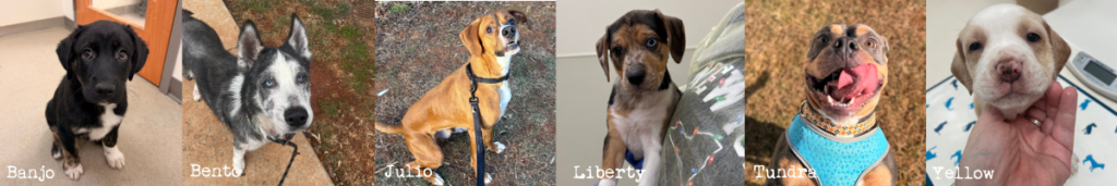 Banjo, Bento, Darlin’, Dash, Delilah, Gabriella, Julio, Liberty, Maggie Mae, Pepper, Quinten, Sal, Stacy, Steve, Tundra, Victor, Yellow.